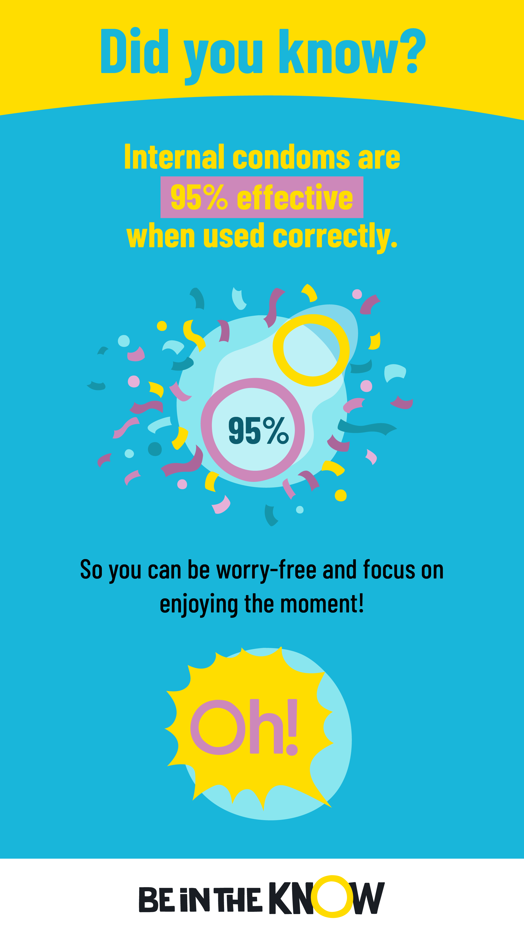 Internal condoms (sometimes called female condoms) are about 95% effective when used correctly. So you can be worry-free and focus on enjoying the moment!